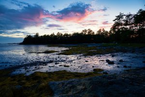 De camping ligt aan de kust en tegen de tijd dat de zon ondergaat gaan we daar een kijkje nemen. Je kunt hem niet in de zee zien zakken, hij verdwijnt achter de bomen, maar ook dat geeft een mooi zicht. Ondertussen zijn er trouwens wel wolken, dan zal je altijd zien. Voorbode van morgen waarschijnlijk want er is regen voorspelt.