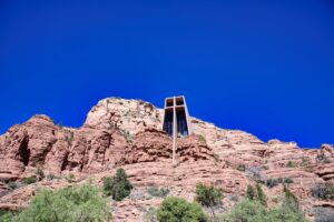 We rijden ook nog naar de Chapel of the Holy Cross. Een kerk, dat lijkt logisch. Maar wel een hele bijzondere. Deze is half gebouwd in een berg. Dat is een imponerend bouwwerkje hoor. Heel strak en modern. Ook even in de kleine kerk geweest, kaarsje aangestoken voor diegene die we moeten missen.