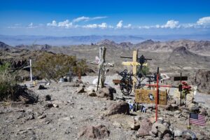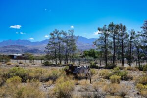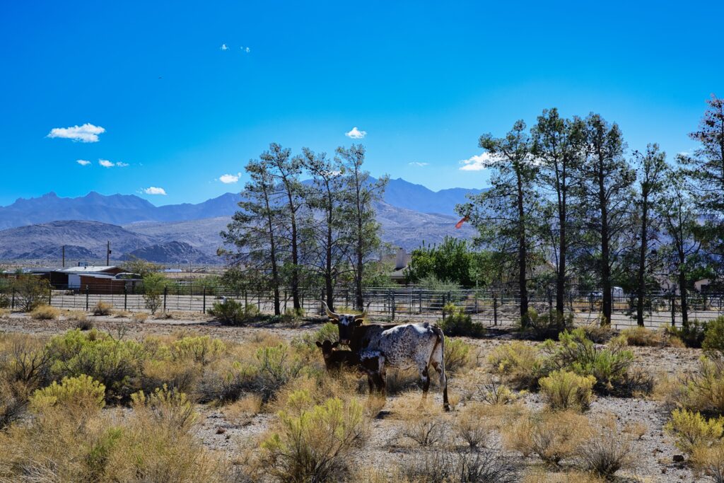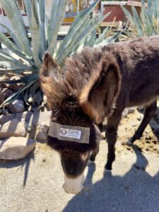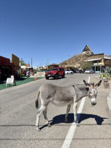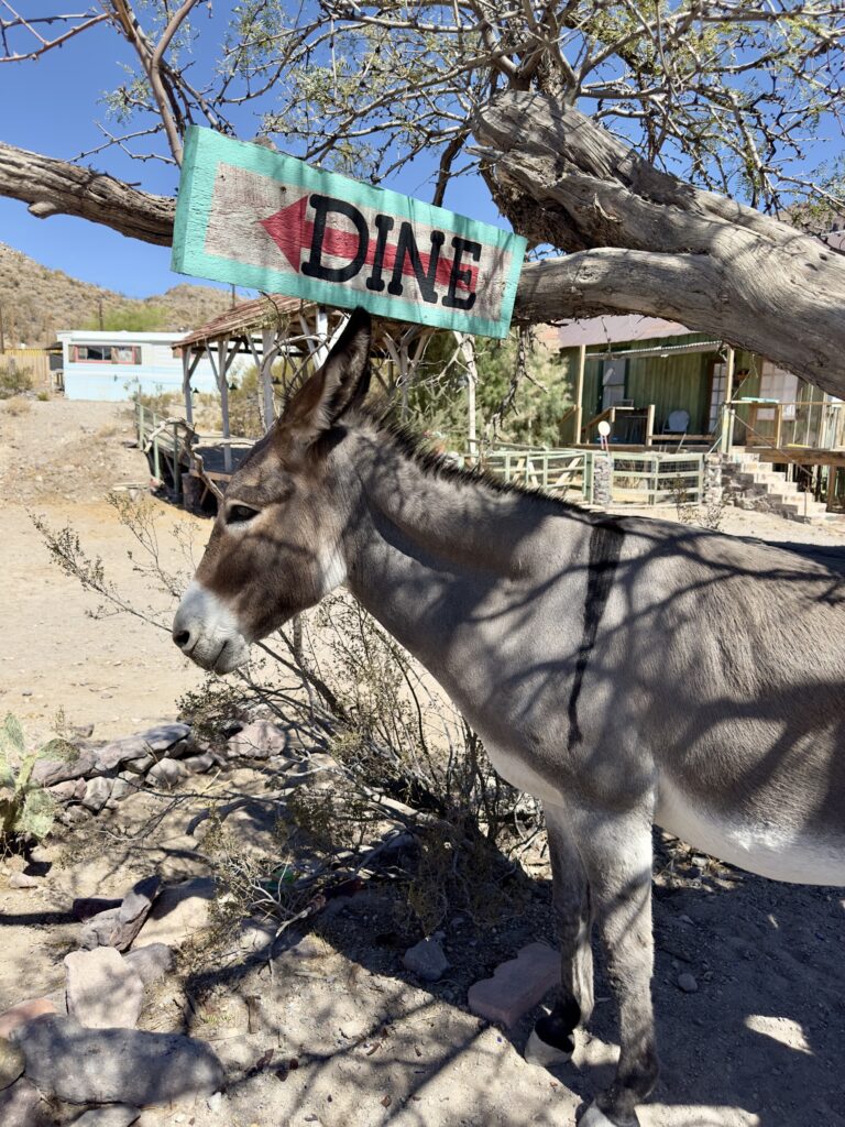 Als je aan de andere kant van de pas beneden bent, dan zit je al snel in Oatman. Daar zien we ook de eerste ezels. Onderweg zijn we ze niet tegengekomen. We parkeren de auto aan het einde van het dorpje op het gratis parkeerterrein. De ezels zijn hier ooit achtergelaten door de mijnwerkers. Ze leven nu in het wild in de vallei, maar op de dag komen ze naar het dorpje. Nou ja, gehucht. In de winkels kun je eten kopen om zo de ezels te kunnen voeren.