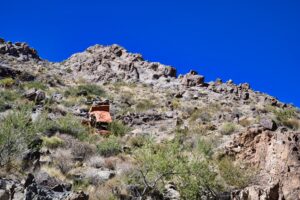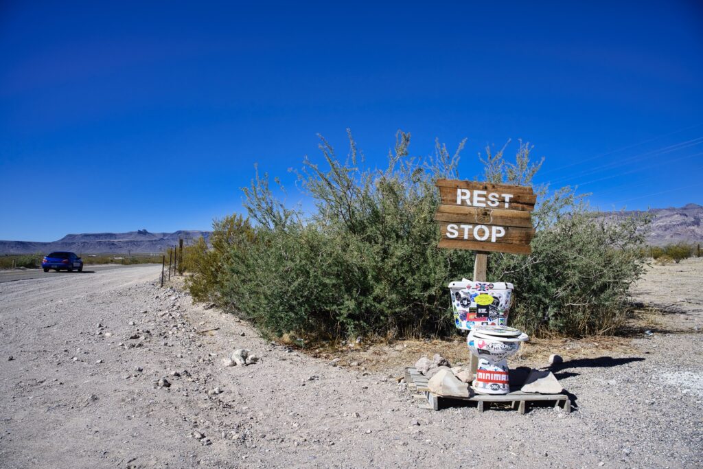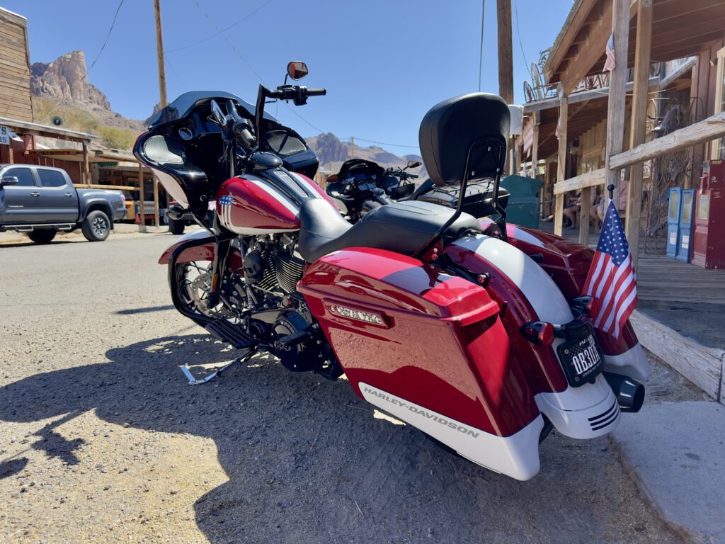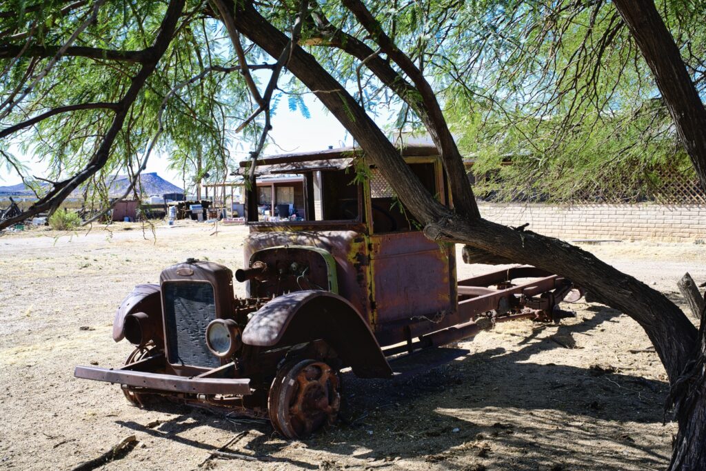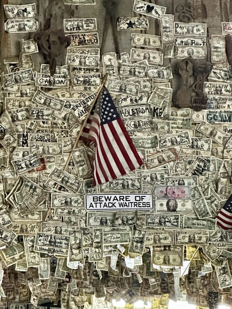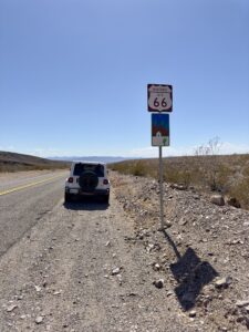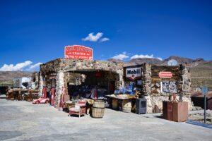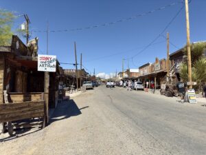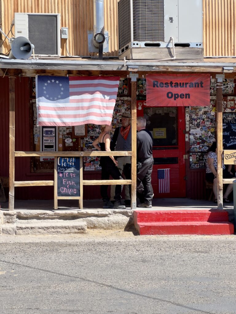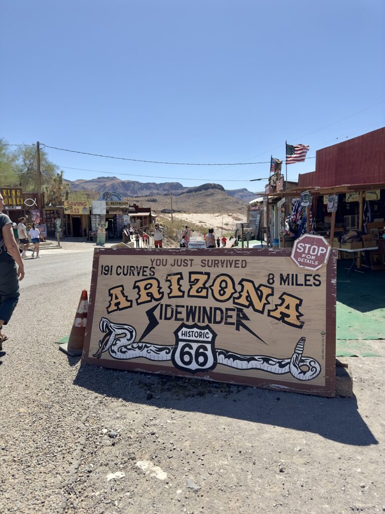 Dan volgen we de 66 tot in Oatman. Het hele stuk kun je de 66 nog echt rijden. Voordat we in Oatman zijn moet je de Sitgreaves Pass over. Maar eerst nog even een stop bij Cool Springs. Ooit was het een benzinestation, toen is het afgebrand, weer opgebouwd in 2002 en nu is het een leuk winkeltje. In 2004 waren we hier ook, toen was alles nog een beetje kaal, dat is nu zeker niet meer zo. De dame van de winkel ons waarschuwt ons voor ezels op de weg als we naar Oatman rijden.