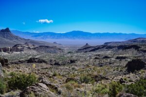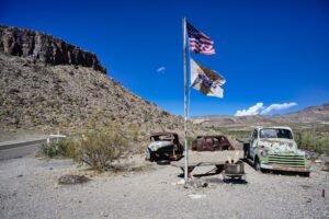 Eerst de US95 en dan de State Route 62. Er valt niet heel veel te zien onderweg, vooral woestijn en af een toe wat bergen. Als we op de 62 zitten zien we een hele donkere lucht in de verte. Daar valt op zeker een buitje zeggen we nog. De donkere lucht komt dichterbij, of wij komen dichterbij, dan kan ook. Hoe dan ook, al snel rijden we in een hoosbui.