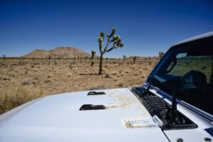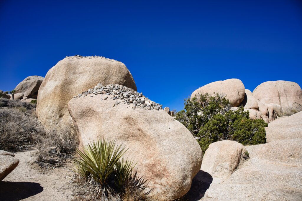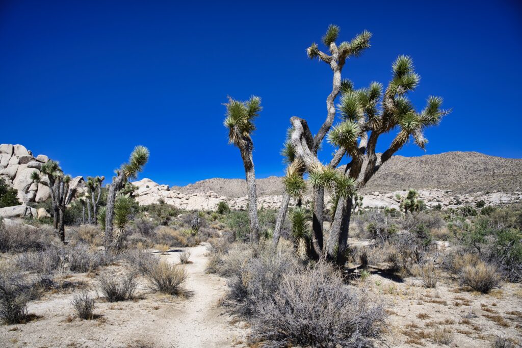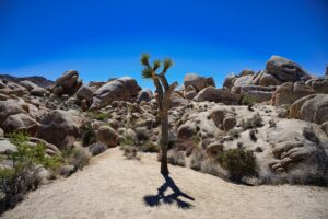 Bijna aan het einde van deze weg ligt de parkeerplaats voor de wandeling Wall Street Mill. Hier staan nog twee andere auto’s, prima. Je wil niet het gevoel hebben dat je in de echte Wall Street loopt. Water mee, want inmiddels is het 28 graden en geen wind. Ook is er zo goed als geen schaduw op deze trail. Er staan wel veel Joshua Trees, maar die geven niet zoveel schaduw met hun rare vormen.