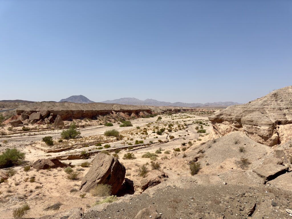 St. Thomas is een dorpje van begin 1900, dat bij de bouw van de Hooverdam (1931 – 1936) onder water is gezet. De bevolking werd gevraagd te vertrekken. Vanwege het dalende waterpeil in Lake Mead is het nu weer tevoorschijn gekomen. Nou, wat er van over is dan. En dat is niet heel veel. Je kunt naar de restanten toe lopen via een wandelpad van 6 km. Dat vinden we met deze temperaturen iets te veel van het goede. Er is totaal geen beschutting van bomen of iets dergelijks. Wel is het bijzonder om te zien vanaf boven. Raar dat hier alles jaren onder water heeft gestaan, kan je je nu niet voorstellen. Bij het begin van de trail staat wat uitleg over het verhaal van St. Thomas. Zeker interessant. We zijn hier overigens de enige, verder niemand gezien. Ook niet op de dirt road heen en terug.