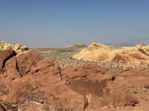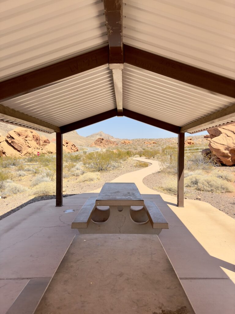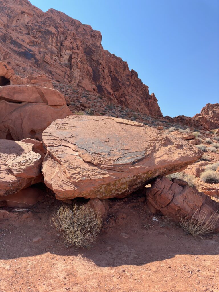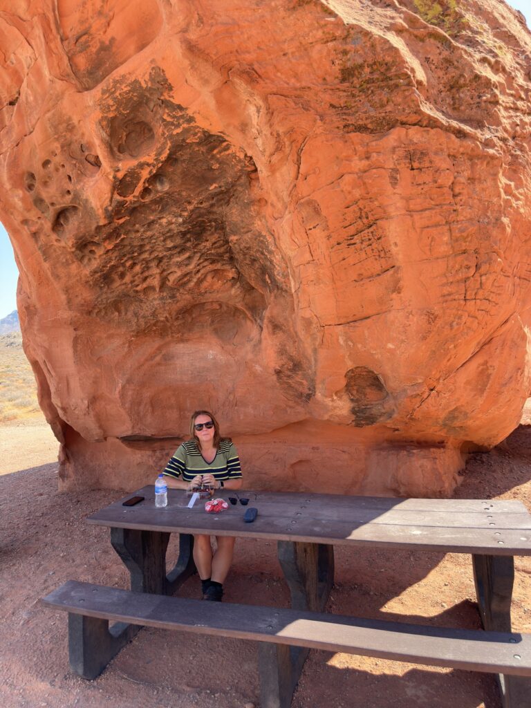 We verlaten het Lake Mead NRA en gelijk is daar de afslag naar Valley of Fire State Park. We hebben nog even getwijfeld of we er heen gaan omdat het zo warm is, inmiddels hebben we de 40 graden weer bereikt. We zijn er eerder geweest en weten dus ook dat het er heel mooi is. Dus we gaan toch, we willen het toch weer even zien als is het maar om door heen te rijden, want dat is al een feestje. Sowieso zijn de meeste trails afgesloten i.v.m. het weer van mei tot eind september. Een paar korte wandelpaden zijn nog wel geopend. Maar ook dat doen we niet. We eten nog wat fruit op een bankje die onder een rots staat, toch nog een beetje schaduw gevonden. Hier staat ook een rots naast met oude rotstekeningen.