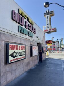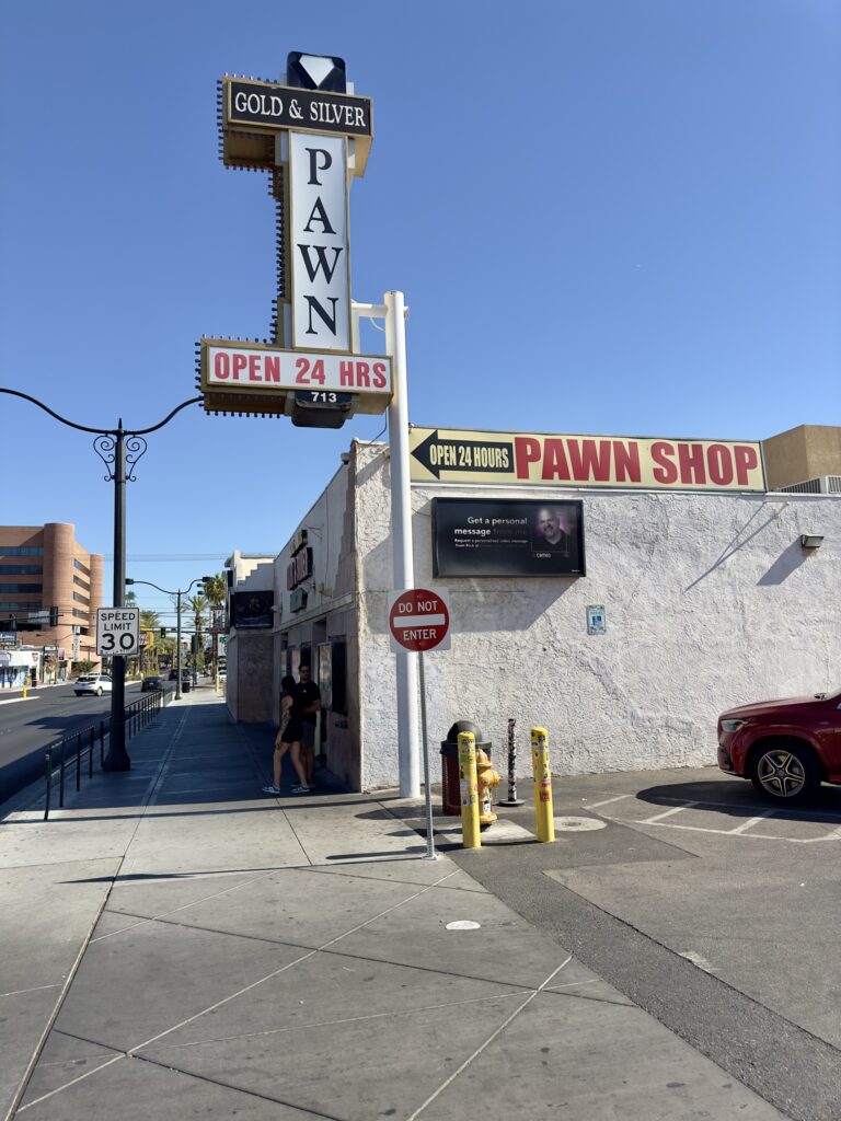 Maar terug naar vanmorgen. De auto in dus. We gaan naar dรฉ Pawn Shop. Dit is het pandjeshuis de Gold & Silver Pawn Shop van de familie Harrison. Op tv is Pawn Stars is een Amerikaanse realityserie.