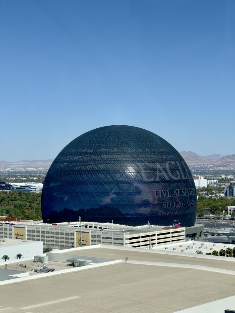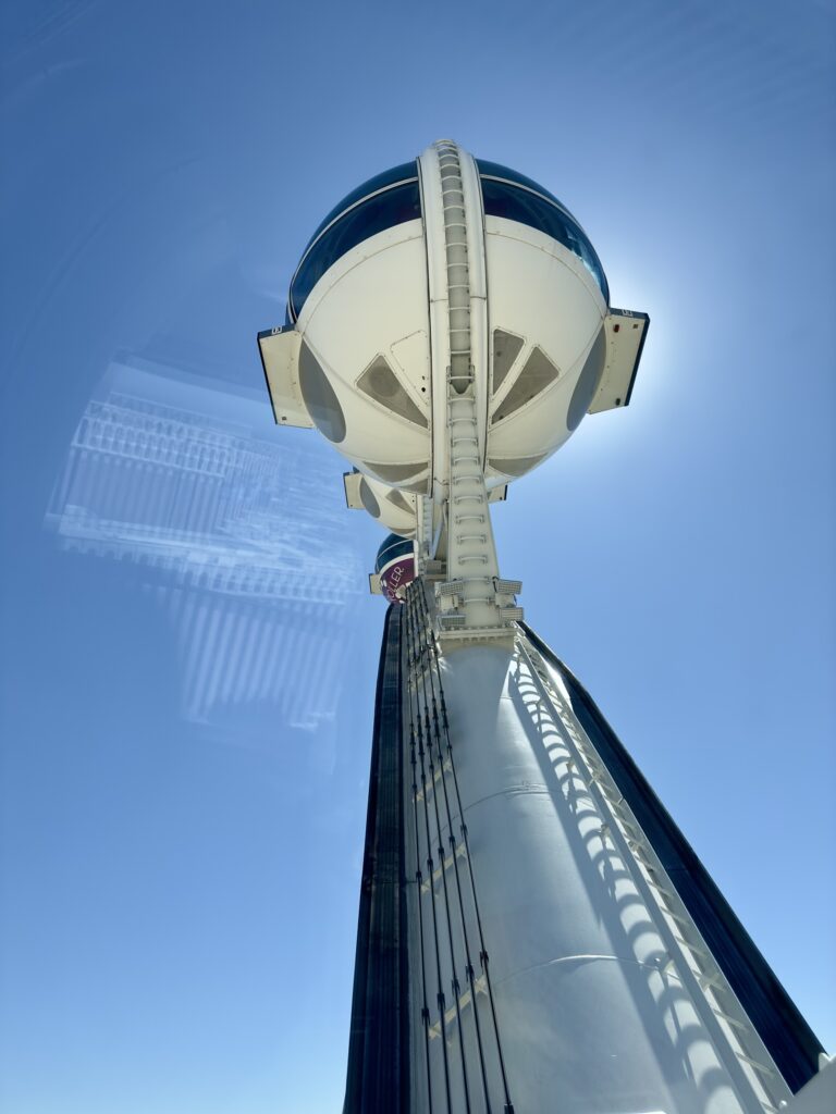We gaan ervoor. We hebben de bol bijna voor ons alleen, we hebben 1 medepassagier. Dat is echt heel fijn, je kan constant lopen en staan waar je wil. Het is mooi! Leuk om Vegas vanaf hoogte te zien en alle bekende hotels en andere bezienswaardigheden. Ook de Sphere zie je hier goed. In avond zal het uitzicht ook heel mooi zijn verwacht ik. Maar ja, je moet keuzes maken hรจ.