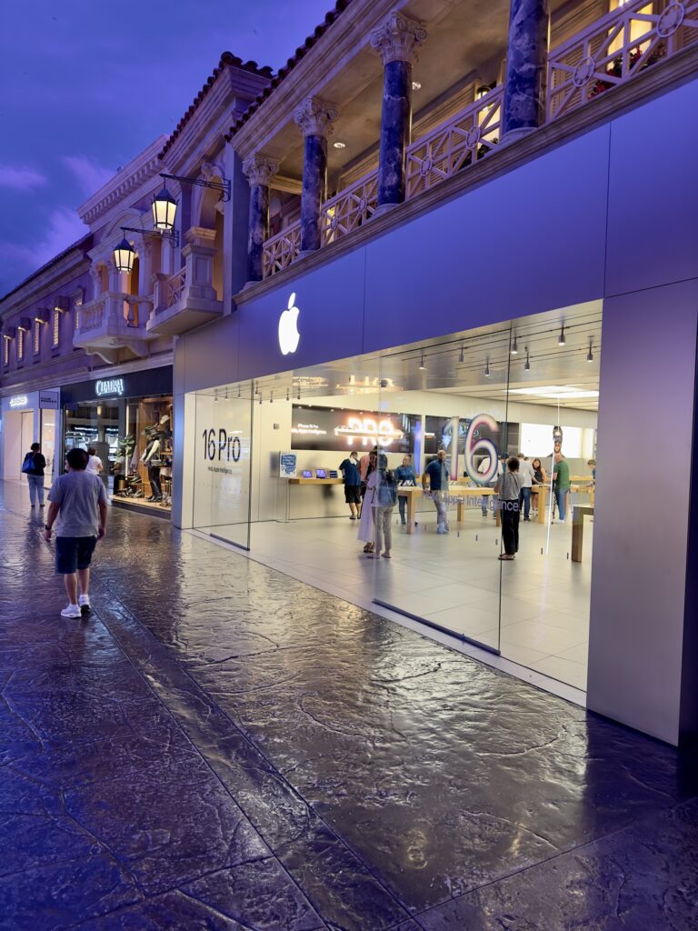 De Forum Shops zijn weer indrukwekkend. We waren toch ook weer een beetje vergeten hoe groot het daar is. Prachtige winkels, alle grote merken zitten hier. En ook de Apple Store. Jos bekijkt even de nieuwe iPhone 16. Deze is niet op voorraad, nou weer zo jammer.