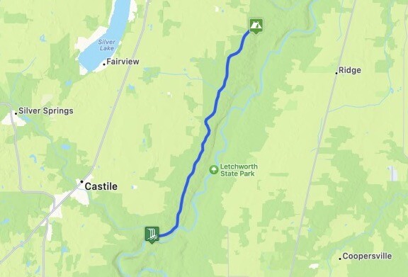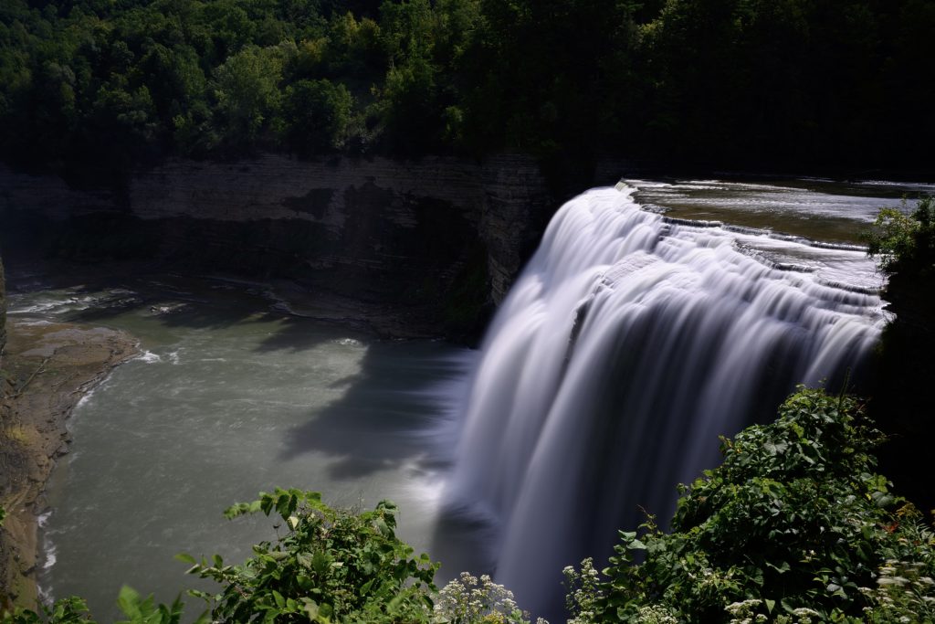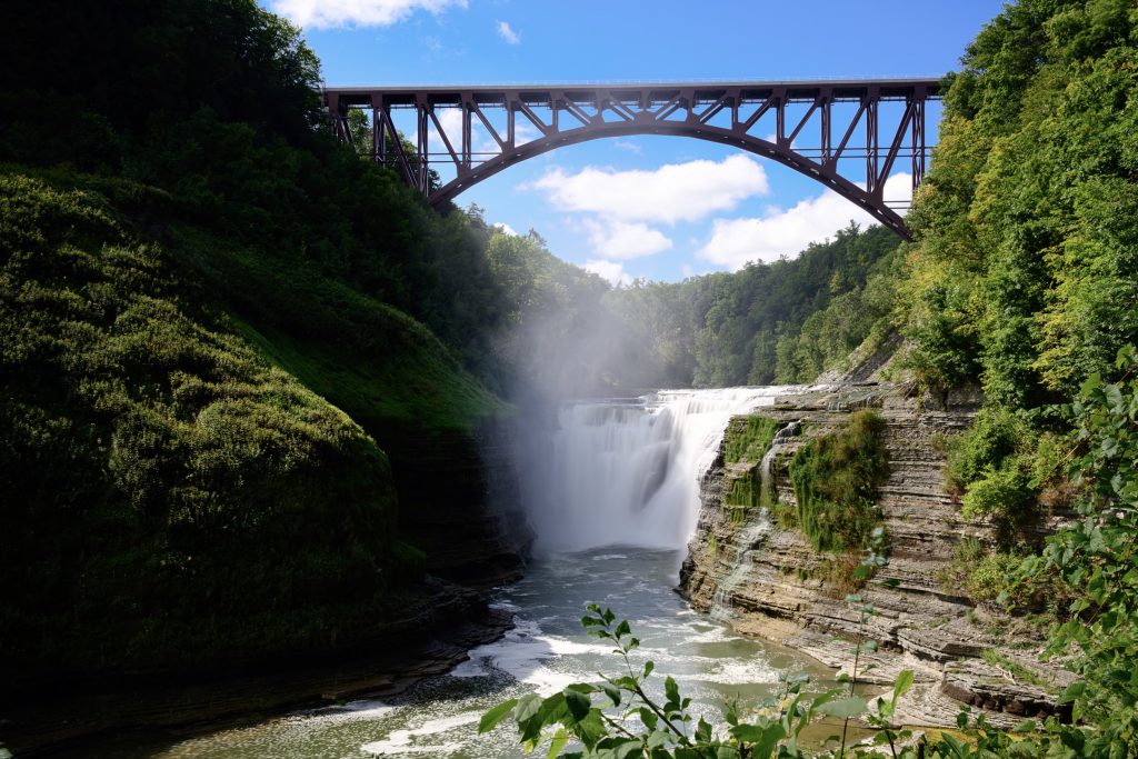 Mooie dag vandaag! Het zonnetje schijnt als we om 9.00 uur op pad gaan. We rijden naar het zuiden van het park. Het park is langgerekt en loopt van noord naar zuid, de camping ligt meer in het noordelijke deel. Maar de watervallen, waar het hier toch eigenlijk om gaat, liggen in het zuidelijke deel. Dat is ongeveer een half uurtje rijden. Het park staat ook wel bekend als “Grand Canyon of the east”, en bij onze eerste stop begrijpen we dat ook wel. De Genesee River stroomt diep beneden in het dal, met prachtige hoge, steile, uitgesleten rotswanden. Dat alles omgeven met bomen, heel veel bomen. We gaan eerst naar de Upper Falls, die liggen het meest zuidelijk. Dat begint al gelijk met heel veel trappen lopen. Maar het is het waard, schitterende waterval met daarboven een spoorbrug. Veel nevel komt er van de waterval wat het altijd een beetje mysterieus maakt.
