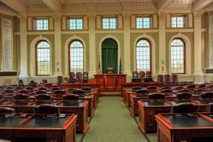 Congress is niet in sessie vandaag dus we kunnen deze kamer ook bezoeken, we mogen zelfs even de hamer van de voorzitter vast houden, hahaha. Ook de Senate is er niet, die kamer mogen we ook in, maar daar mogen we niet naar het bureau van de voorzitter lopen, we moeten achter de stoelen blijven. Alle vertrekken hangen vol met schilderijen van gouverneurs. Het heeft allemaal wat statigs. Om 12.15 uur moet ze de tour afbreken, want hij duurt eigenlijk maar een uur. Het was leuk dat ze zo enthousiast vertelde. We mogen gerust nog door het gebouw lopen en kijken waar we willen.