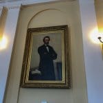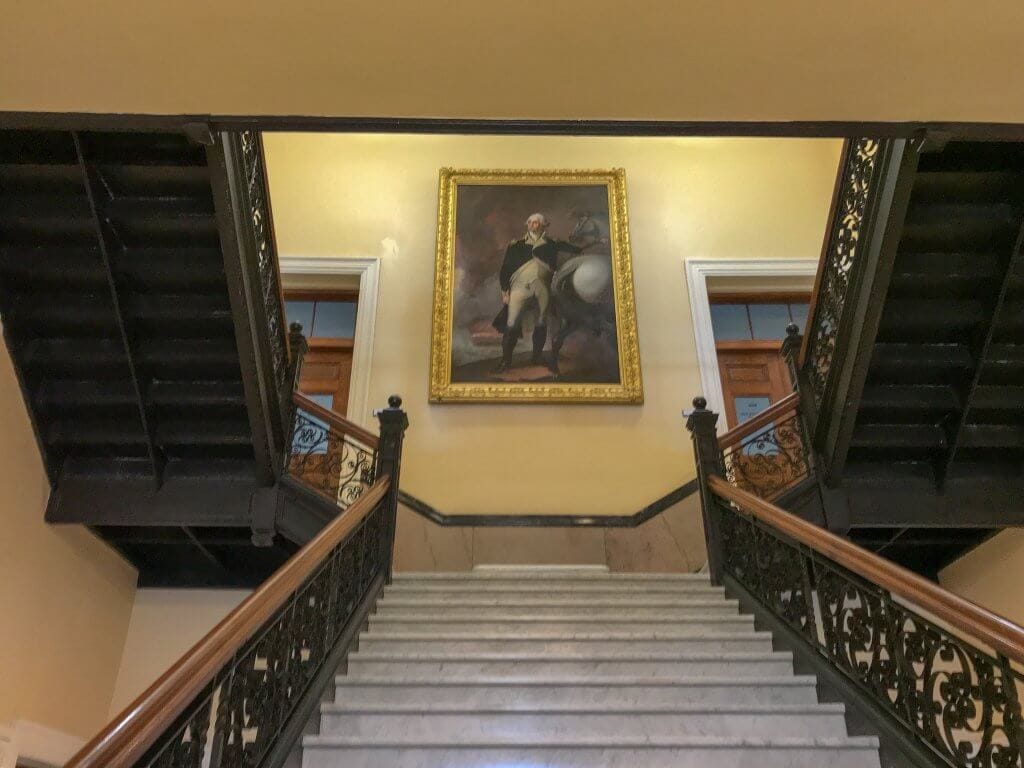 We beginnen in de Hall of Flags, hier geeft ze meer uitleg over het gebouw zelf en over de vlaggen die er hangen. Dit zijn echter replica’s, de echte hangen in het Maine State Museum aan de overkant. Die kunnen de vlaggen beter conserveren. Aangezien er hele oude vlaggen tussen zitten van o.a. de burgeroorlog klinkt dat als een goed plan.