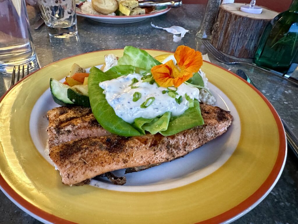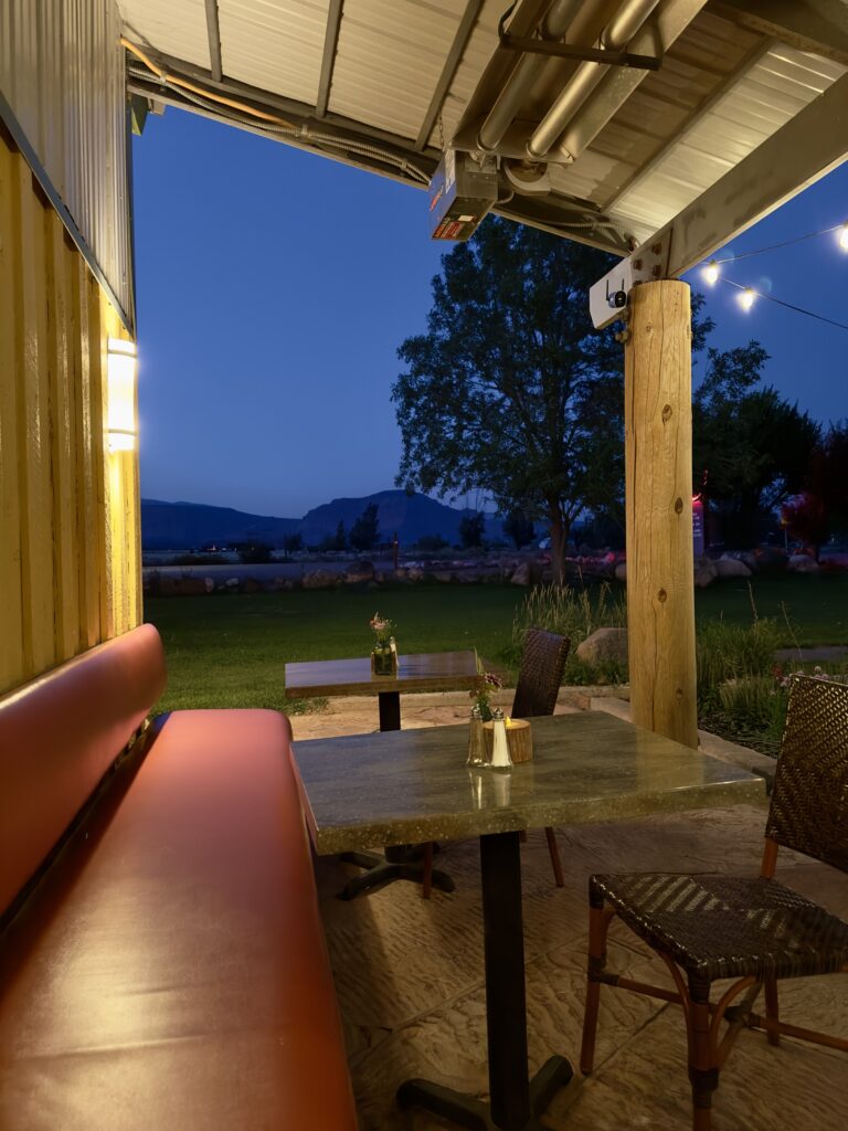 Tegen half 7 rijden we naar Torrey om te eten. Dat is echt maar 3 minuten rijden. We kiezen voor Hunt & Gather Restaurant. En dat is een beste keus! Jos neemt hert en ik neem forel. Zalig! De margaritaโs smaken hier ook prima. We zitten nog lekker buiten, temperatuur is nog prima.