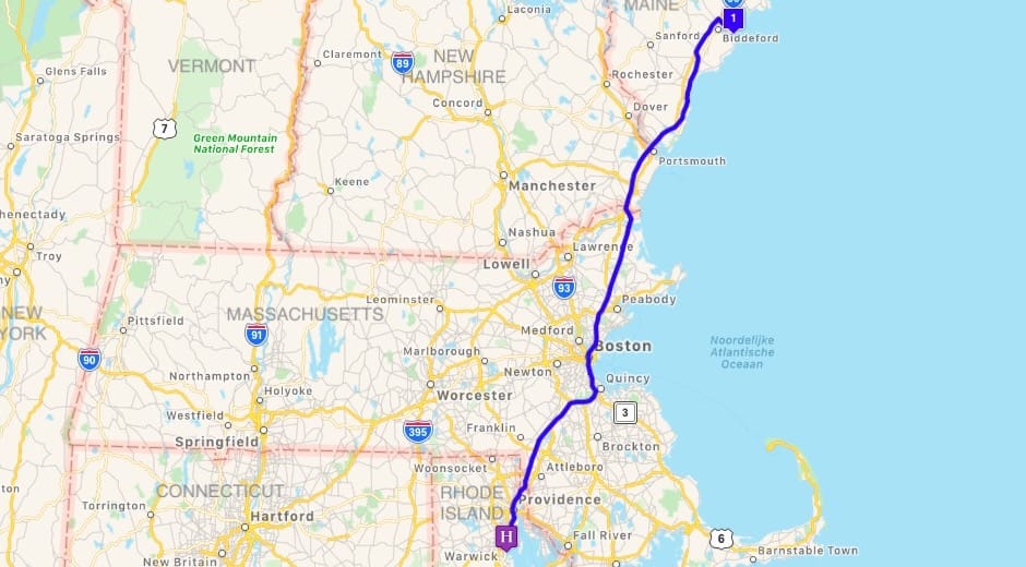 We rijden onze laatste staat van vandaag binnen; Rhode Island. We rijden door Providence, de hoofdstad. Daar raken we de 1 toch even kwijt, de verkeersborden zijn hier een beetje karig. Maar na een beetje rondjes rijden vinden we hem wel weer natuurlijk. Hij gaat hier een stukje samen met de I95, net als in Boston trouwens. We vinden Providence er niet heel spannend uitzien, dus we stoppen er verder niet.