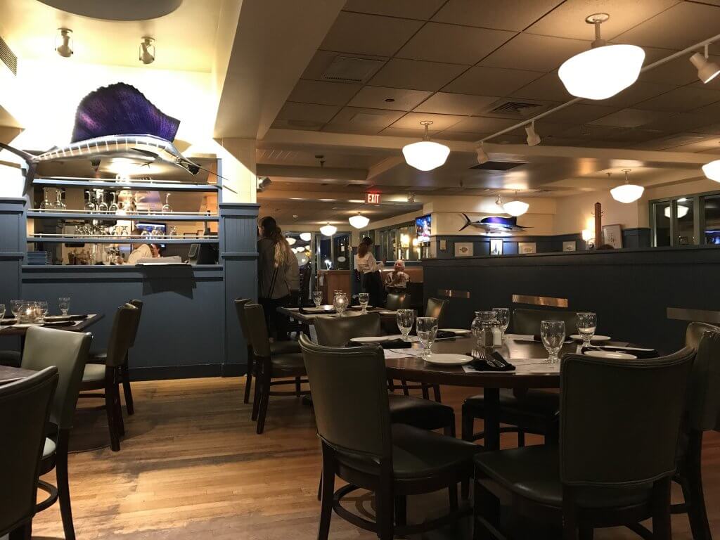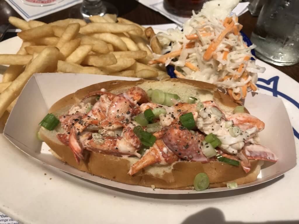 Het blijft de hele avond zachtjes regenen. Dus ook als we gaan eten. We lopen (ja, lopen) naar de overkant. De temperatuur is nog prima, 23 graden. Het restaurant heet Legal Sea Food. Het mag duidelijk zijn, we eten vis vanavond. Jos neemt de lobster rol en ik ga voor de fish & chips. Heerlijk gegeten. Ook het toetje mag genoemd worden; banaan met warme karamel saus, rum en vanille ijs